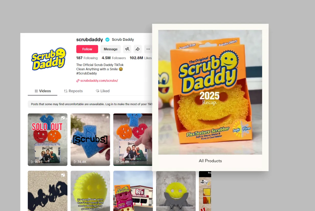 Scrub Daddy is proof that even a household-name brand still has to earn attention in the feed. Their winning move is simple: content feels native. It opens like entertainment (POV style, humor, trends), then the product shows up as part of the story.