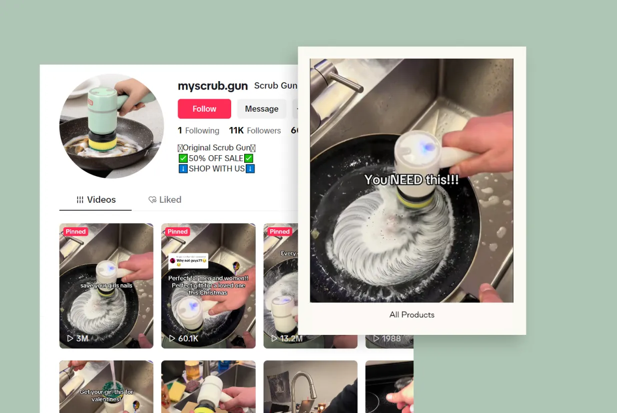 Scrub Gun leans into a smart psychological trick: they frame the product like it’s already validated (“TikTok made me buy it”). Even if an account’s recent numbers look uneven, one breakout hit plus consistent posting can carry a store for months.